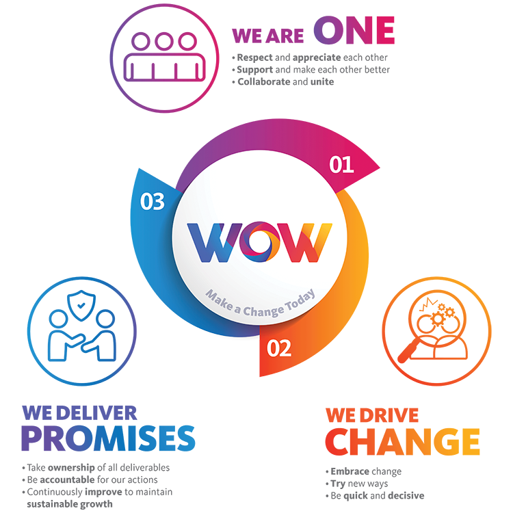 WoW encapsulates three core values – We Are One, We Drive Change and We Deliver Promises.